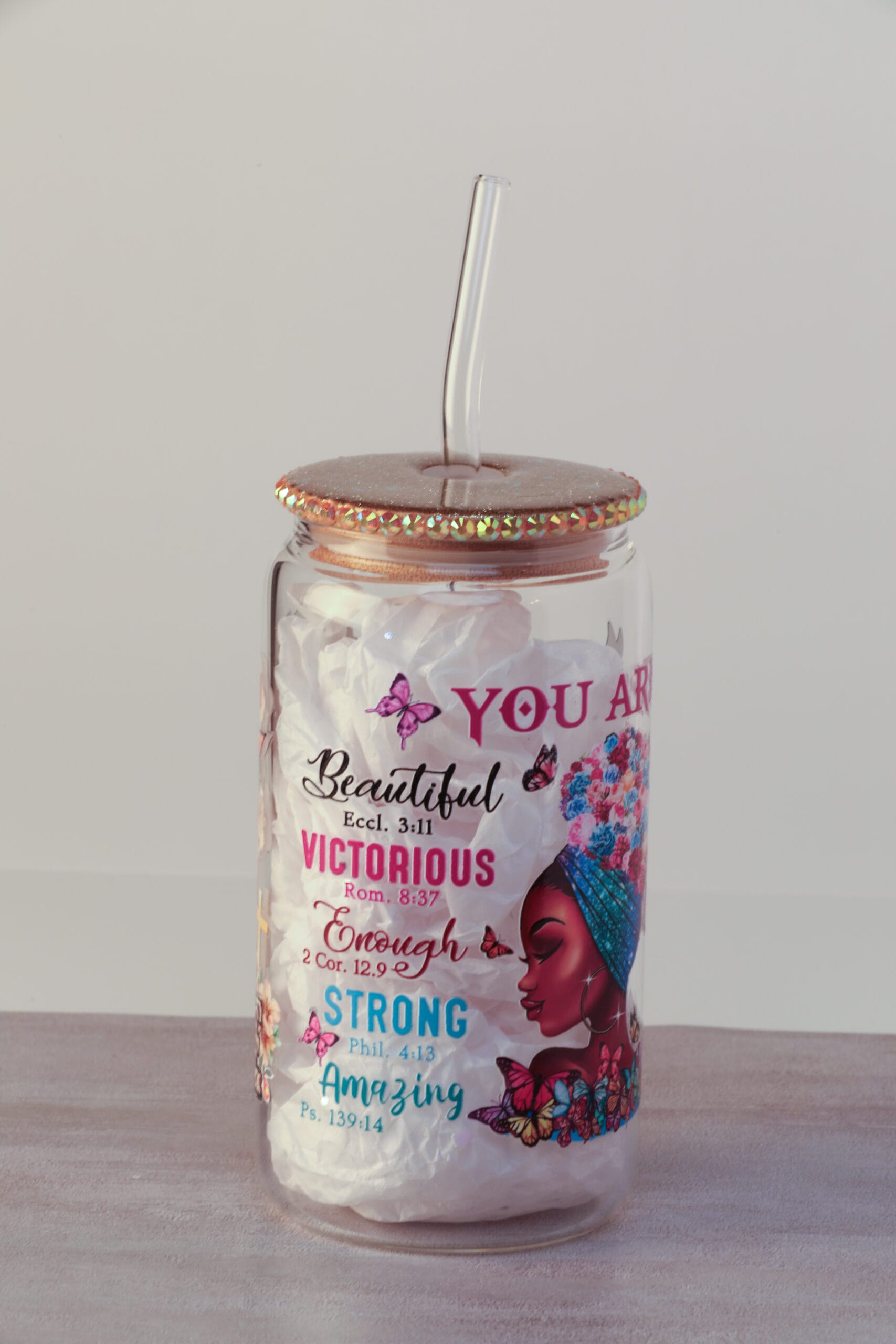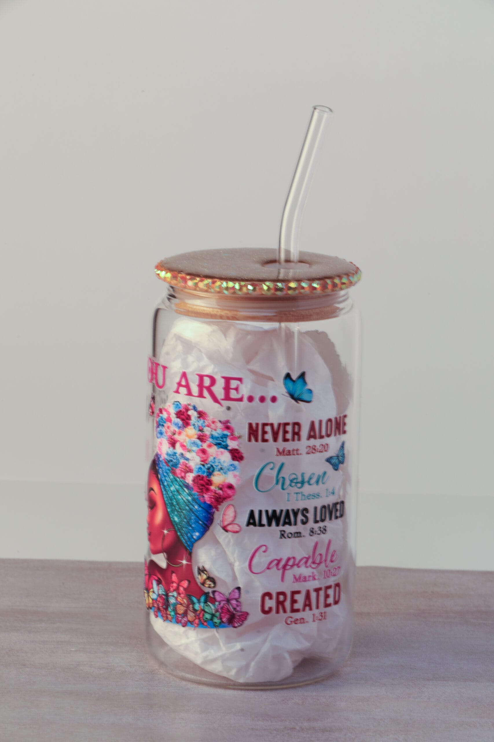 You Are Never Alone, Chosen, Always Loved, Capable, Beautiful, Victorious, Enough, Strong, Amazing, and Created Glass Tumbler Glass TumblerYou Are Never Alone, Chosen, Always Loved, Capable, Beautiful, Victorious, Enough, Strong, Amazing, and Created Glass Tumbler Glass Tumbler